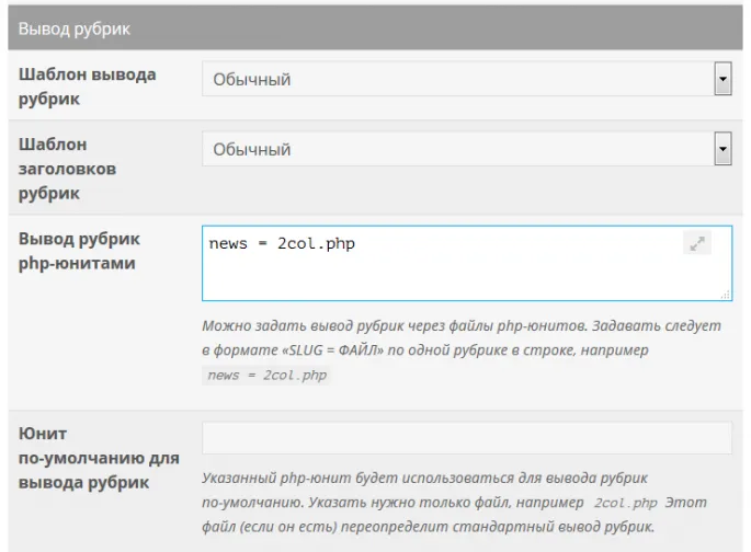Пока я не включал в default-шаблон пример использования. Сделаю это немного позже. Но общий смысл здесь в том, что при выводе рубрики подключается заданный php-юнит (в type/category/units/). В нём можно задать свой вариант вывода для данной рубрики.