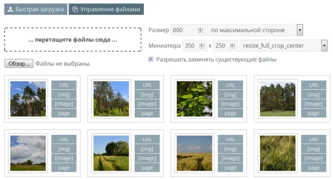 Опция «Разрешить заменять существующие файлы» позволяет заново загрузить файл с тем же именем. Раньше приходилось идти к управлению файлами, чтобы удалить файл. Теперь это лишнее. Пригодится тем, кто привык подбирать размер фото, чтобы они красиво смотрелись на странице.